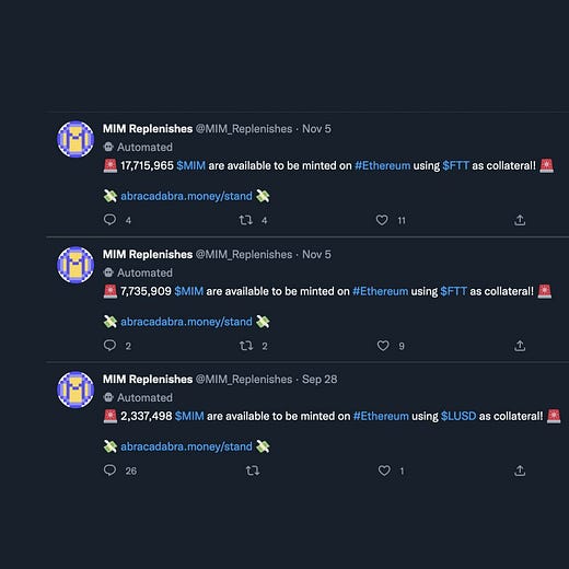 この騒動の前、Alameda ResearchはFTXの取引所トークンFTTの500万FTTに対して2000万MIM(Abracadabraのステーブルコイン)の未払いローンを抱えていました。市場混乱の中、11月9日に負債を完全に返済しました。
